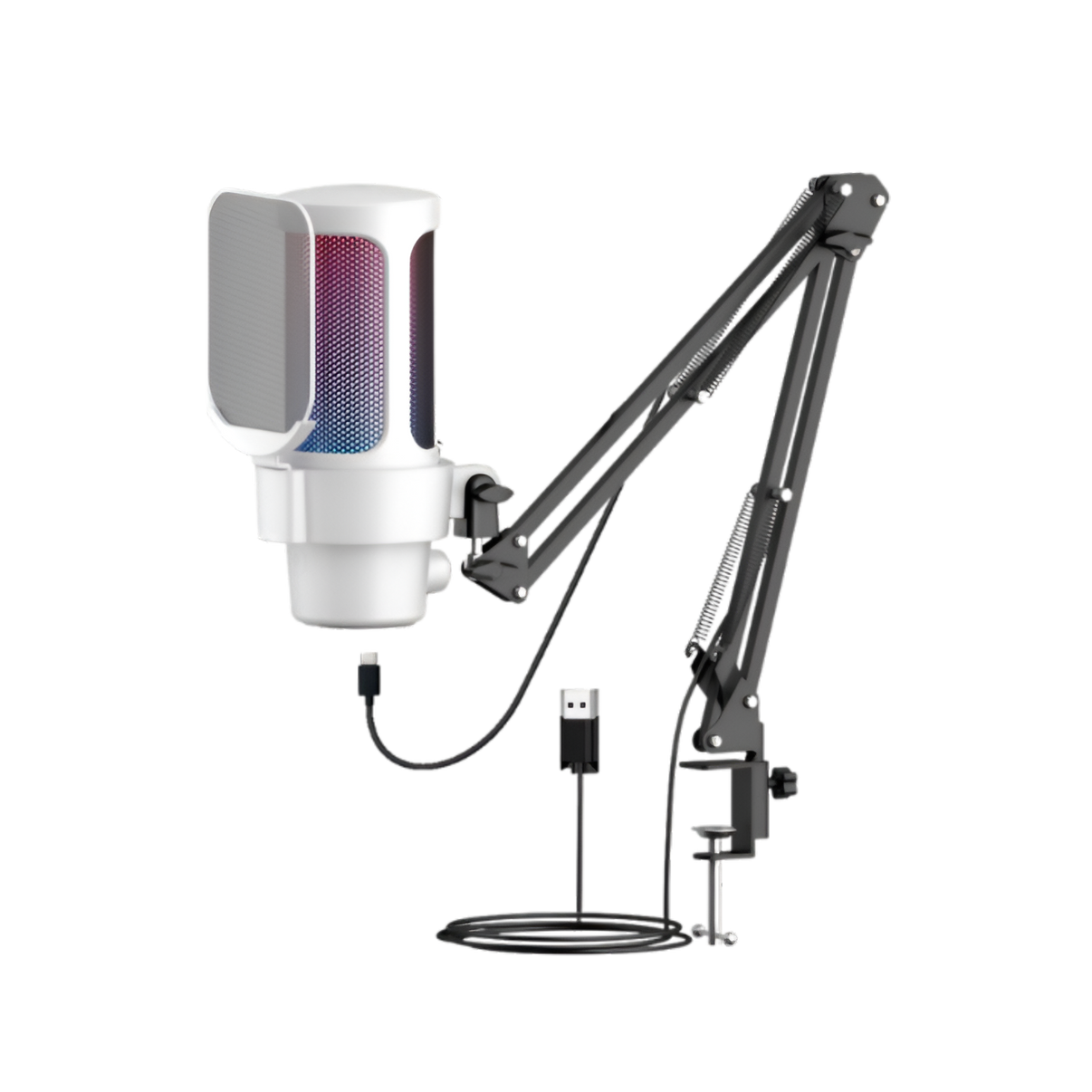 De dynamische RGB-verlichting zorgt voor een levendige sfeer achter je bureau. Kies voor de strakke zwarte uitvoering of ga voor de frisse witte variant – beide kleuren combineren topgeluid met een stijlvol uiterlijk dat perfect aansluit bij elke gaming- of podcastsetup.